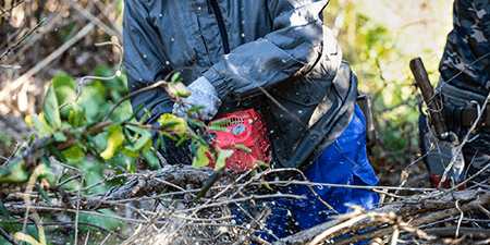 苗木を山に植栽(植え付け)する前には、苗木の生育環境をよくするため、雑草や灌木などを取り除く「地拵え」という整地作業をします。地拵えは林業の中でも大変な作業ですが、気を育てる過程の中で最初に行う重要な仕事です。